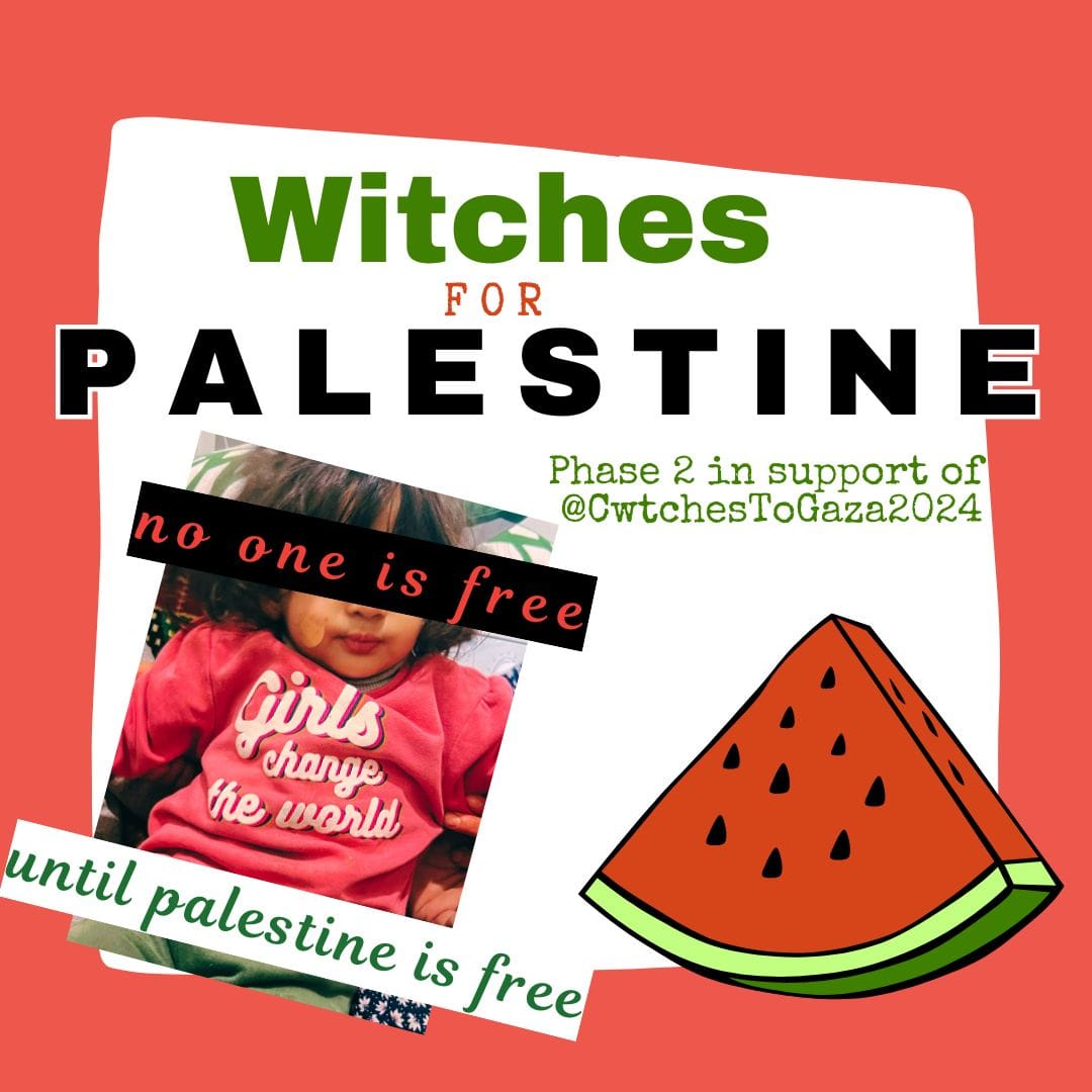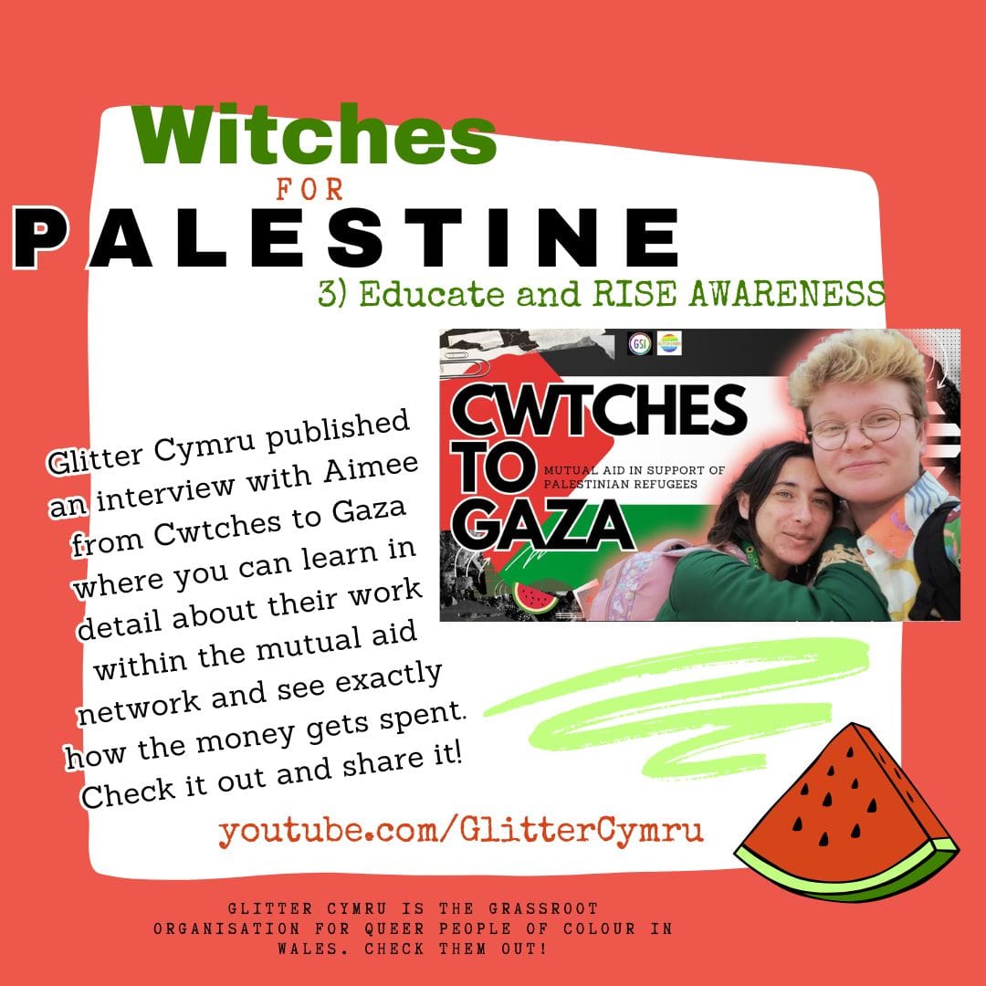 Ysha: What I know how to do is content. Do you need someone to get your information out? Because the speech that you did was amazing. It taught me so much. Can we get your speech out to other people? And that's why then we recorded the interview with Amy, which is now on the Glitter Cymru YouTube, and it's linked on the Witches for Palestine website.