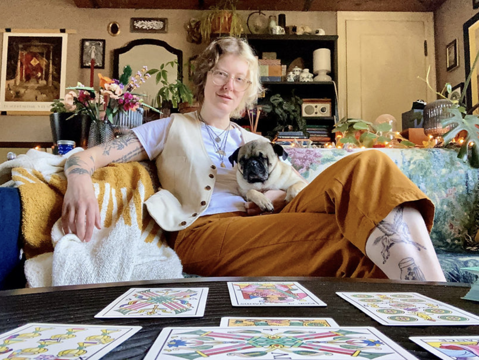 Yeah. Yeah. My decks are Fifth Spirit Tarot and queer Devotion. Nope, that's not a deck, that's a book. See. Horrible. My book, my decks are Fifth Spirit Tarot and the Gay Marsay Tarot. And my books are Radical Tarot and Queer Devotion. Queer Devotion just came out a few months ago. And I have a substack called Queerly Devoted where I write about.