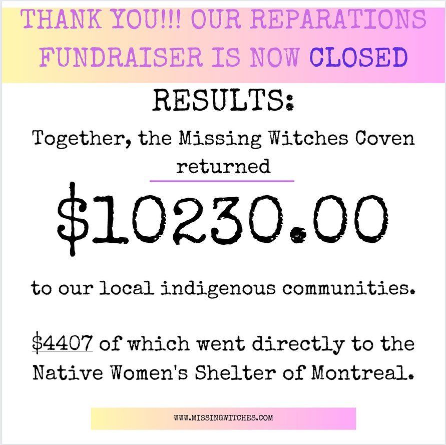 This year, the Missing Witches Coven returned $10 230.00 (that’s right, over TEN THOUSAND DOLLARS - almost DOUBLE what we raised last year) to our local indigenous community support orgs - $4407 of which went directly to the Native Women’s Shelter of Montreal. The raffle prize winners have been notified! HUGE love and gratitude to everyone who made this year’s fundraiser a smashing success - prize donors, money donors, WE LOVE YOU!!!!! See you next year!!